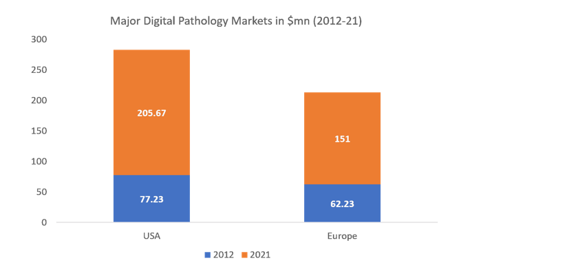 It is estimated that the Europe Digital Pathology Market to hit $151m by 2021 from $62.3m in 2012. During the same period, the USA Digital Pathology Market will reach $205.67mn from $77.23mn at a CAGR of 17%. Among all the countries, North America will dominate the Digital Pathology market followed by Europe, Latin America and Asia Pacific. Asia Pacific will witness the fastest growth (at a CAGR of 13.4%) during the forecast period. Growth will be supported by the increased number of cancer patients, increased demand of novel patient care facilities and reduced laboratory expenses.